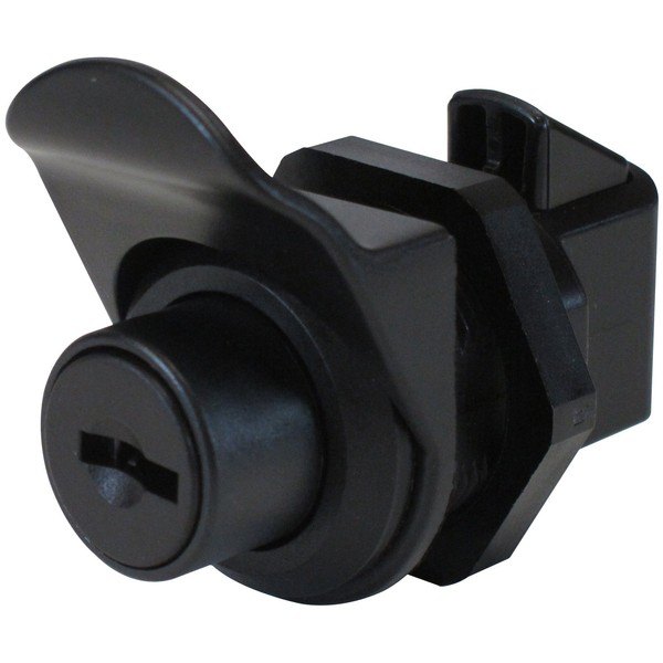 - UV stabilized black plastic push button latch commonly used on glove boxes and radio box doors