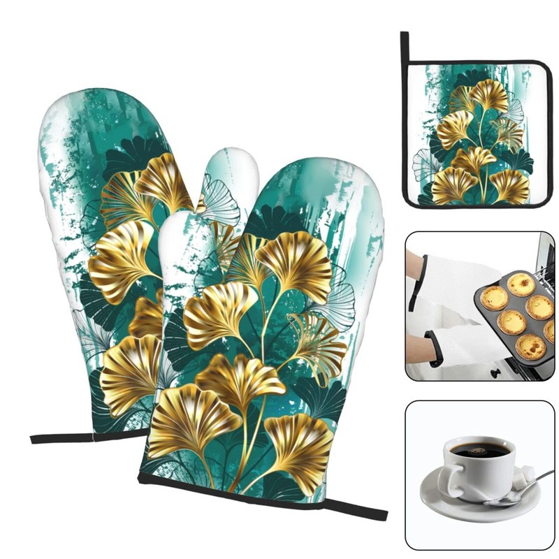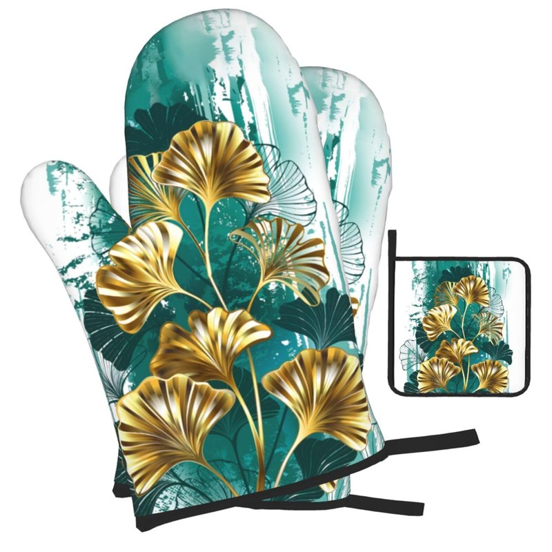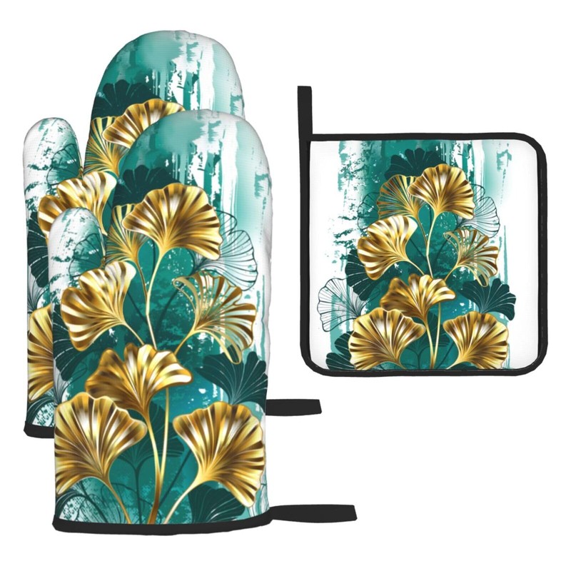 Teal Gold Green Leaves Oven Mitts and Pot Holders Set Heat Resistant Non Slip Set of 3 Decorative Kitchen Gloves Hot Pads for Cooking BBQ Baking Grilling