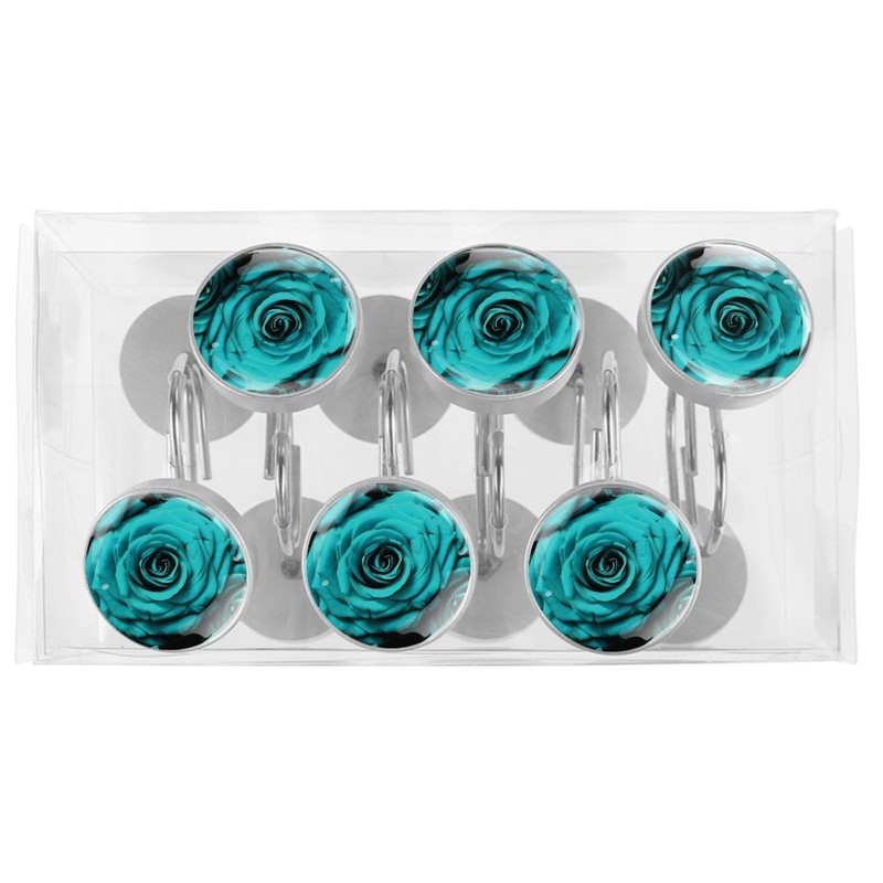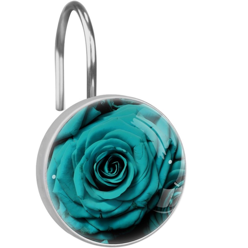 Teal Romantic Rose Floral Decorative Shower Curtain Hooks Rings Set of 12 Hooks for Shower Curtain Stainless Steel Rustproof Curtain Rings for Bathroom