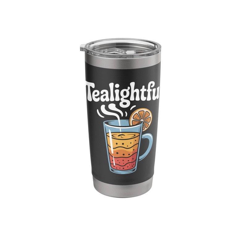 - Immerse yourself in the whimsical charm of the 'Tealightful' cup design, featuring a steaming mug of layered tea with a refreshing citrus slice, perfect for tea enthusiasts.