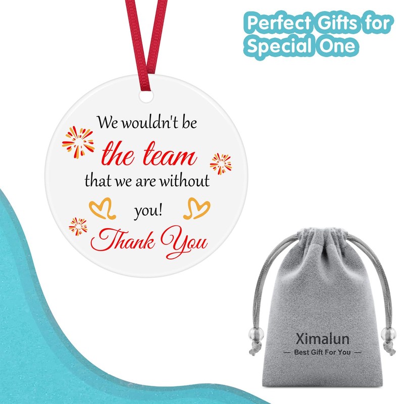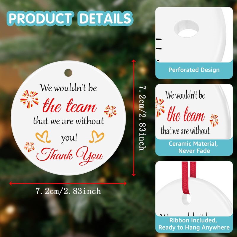 - Thank You Ornament: This beautiful ceramic ornament makes a great keepsake gift,printed with words “We wouldn't be the team that we are without you! Thank you." A lovely way to express gratitude and appreciation to a boss, leaders, supervisor, mentor, manager, PM,coach,team mom,team member, coworker, colleague,employee, etc.