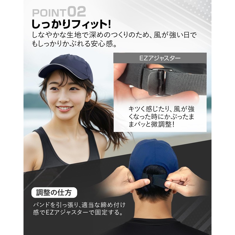 - (High Fit) The flexible fabric is deep, so you can wear it comfortably on windy days. The adjuster is easy to fine-tune even while wearing it, making it very convenient because you don't have to worry about it being too tight or when it is windy