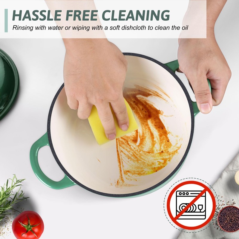 - Effortless Cleaning - The smooth enameled surface not only reduces the risk of food sticking but also makes cleaning a breeze, Easily remove food residue with a soft sponge or dish cloth with gentle wipe or water rinsing, NOT DISHWASHER for ensuring longer service lifespan