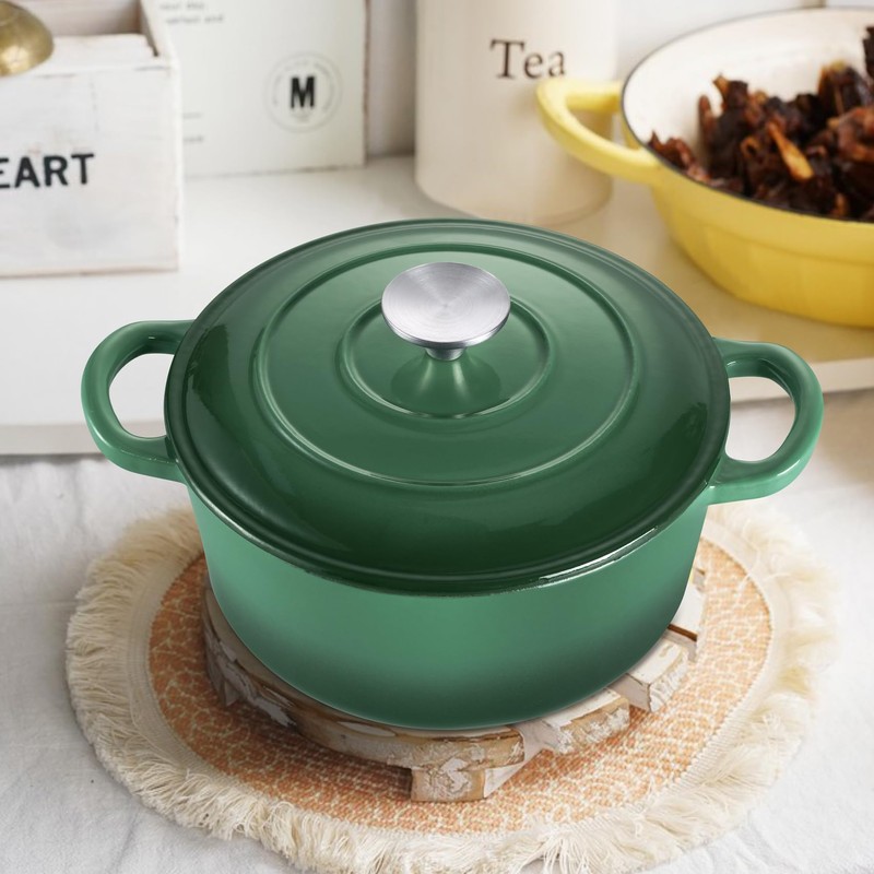 - Non-toxic & Classis Design - TeamFar cast iron dutch oven is constructed by heavy duty cast iron core with enameled coatings, No chemical reaction with food, Safe and healthy for daily use, Ergonomic design with robust double handles for conveniently transporting the pot from oven to table with no fuss, Designed in a wide range of colors between blue, red, white, pink, pistachio green and basil green for your choice, Add a splash of color to your kitchen and perfectly match your cookware