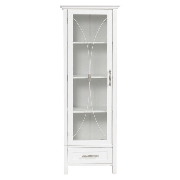 Delaney Linen Tower Storage Cabinet in a white finish has an elegant crown molded top with one door and one drawer offering storage with style for your bathroom. It also offers adjustable shelves making it easy to store items of different sizes. The metal glider drawer allows for easy open and close operation. The tempered glass-paneled doors decorated with Cathedral style wire providing a looming view into the cabinet. It features metal handles for easy opening. This sturdy cabinet comes with assembly hardware.