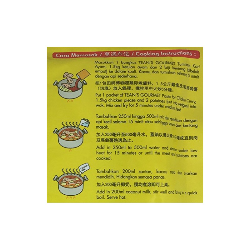 - Recipe: Put 1 packet of TEAN'S GOURMET Chicken Curry Paste (200g), 1.5kg chicken pieces and 2 potatoes (cut into cubes) into the wok. Mix and fry for 5 minutes under medium heat. Add in 250ml to 500ml water and simmer under low heat for 15 minutes or until the meat and potatoes are cooked. Add in 200ml coconut milk, stir well and bring to a quick boil. Serve hot.