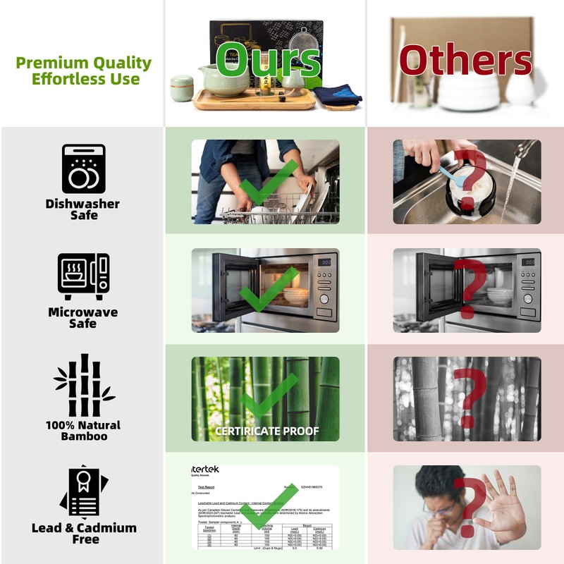 - 100% natural and food-safe: the complete set is made of high-quality natural bamboo + ceramic. No mysterious paints or other chemicals have been used in this product. It is made from 100% bamboo with a vegetable oil finish to improve its durability. Mmatcha bowls were food safe, lead free and cadmium free. The high quality makes it robust and durable