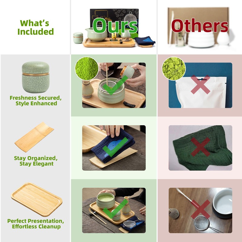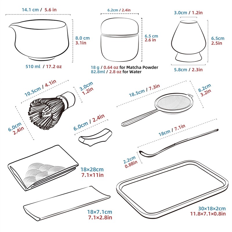 - Premium Machata Ceremony Set. It is 10 pieces/set, includes: 1 x bamboo whisk, 1 x bamboo tea tray, 1 x bamboo shovel (chashaku), 1 x ceramic bowl (chawan) with spour 510 ml/18 oz, 1 x ceramic whisk holder. 1 x ceramic scoop stand, 1 x cotton tea towel (Chakin), 1 x tea towel mat, 1 x matcha powder strainer, 1 x ceramic tea container (18 g matcha powder not included. Only for demonstration purposes). This kit makes it very easy to adopt matcha as a lifestyle
