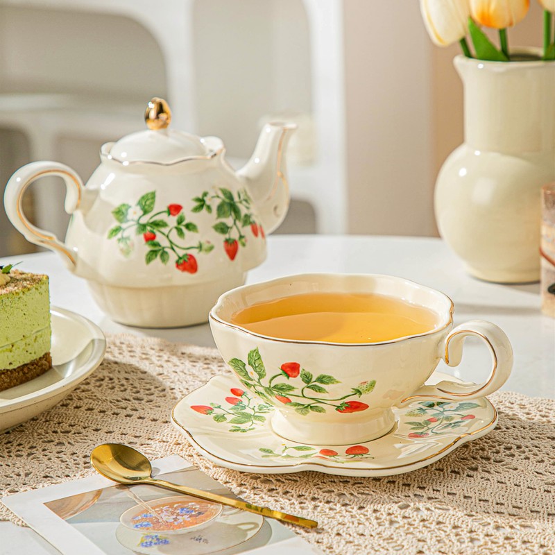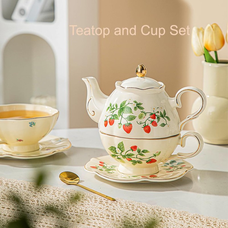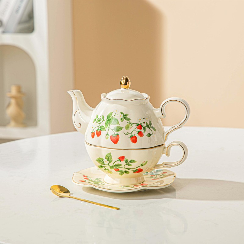 - Tea pot set collectible: Our Tea Set for One, featuring a teapot adorned with Strawberries patterns.They have delicate gold line.Meaning happiness,joy,and freedom.Making this tea set luxury not just functional but also a symbol of positive energy.