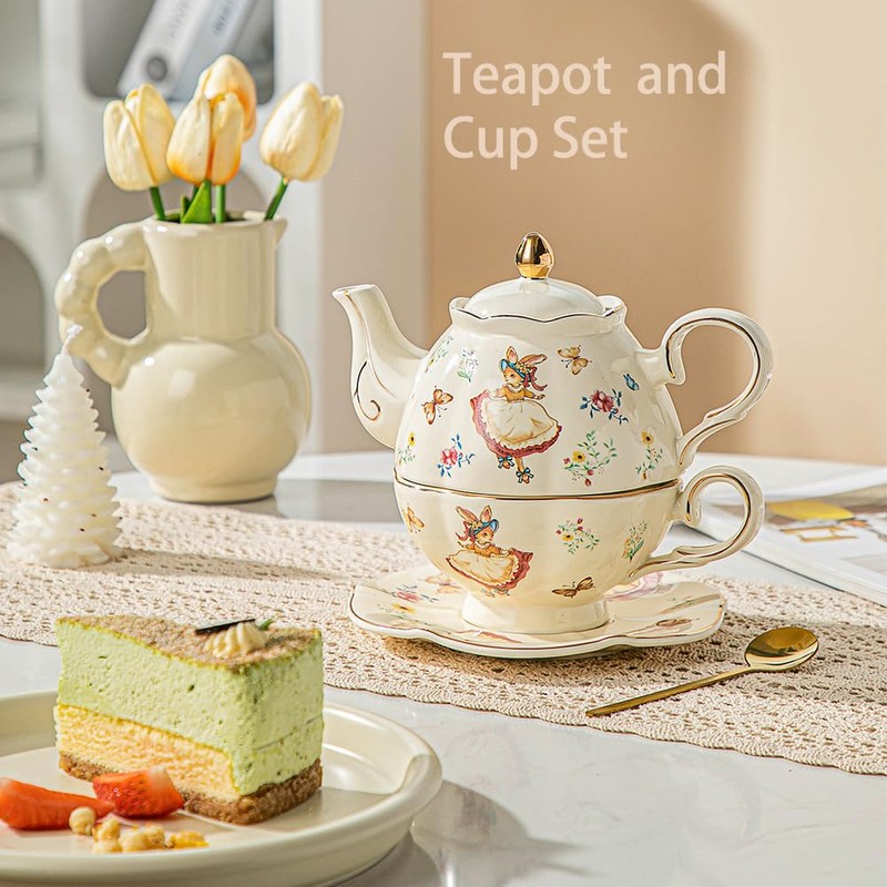 - Bone China teapot for one: What You Will Get Tea Set Decorative:1 teapot(22.53 oz), 1 cup(9.15 oz), 1 saucer, 1 teaspoon. The teapot for one is the perfect size, perfect for a person to enjoy a delicious afternoon tea.