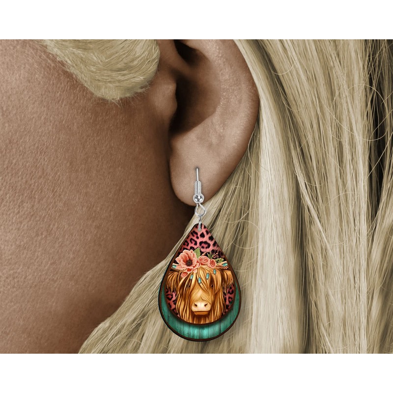 Teardrop Wood Earrings Light Weight Printed Image Dangle Jewelry (Highland Cow)