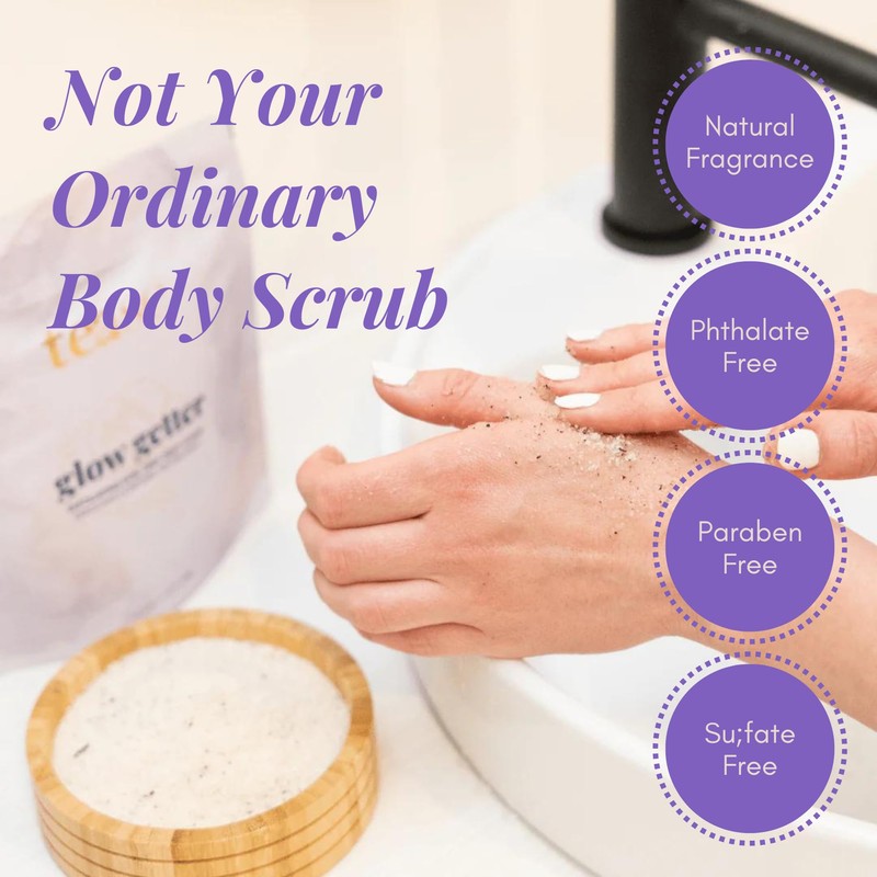 - Self Care Gifts for Women: Our Glow Getter organic skin care is a blend of Sodium Chloride, Organic Sugar Cane, Earl Grey Tea, Coconut Oil, Bergamot Peel Oil, Crambe Abyssinica Seed Oil, Ground Pumice, and Vitamin E. Perfect for a soft, refreshed, and glowing skin!