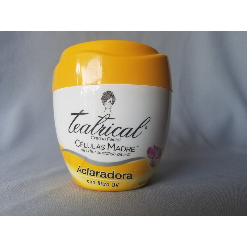Teatrical Crema Células Madre Ultra Aclaradora 200g Nueva y mejorada versión con filtro solar Teatrical Mother cells Cream with UV filter and new image 200g For Sale: 1 Jar of 200 grams///8 Ounces Modo de uso Aplicar en rosto y Cuello diariamente en la mañana y por la noche después de lavarse la cara. • Brinda Elasticidad a Los Tejidos • Para todo el cuerpo/Full Body Cream • Celulas Madre actúa como un humectante poderoso • Genomme Lab |