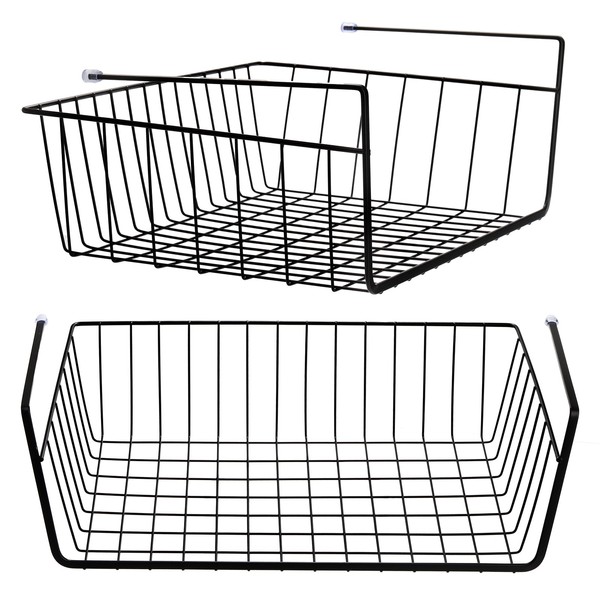 Tebery 2 Pack Black Under Shelf Wire Basket, Hanging Storage Baskets Under Cabinet Add-on Storage Racks, Slide-in Baskets Organizer for Kitchen Pantry Desk Bookshelf
