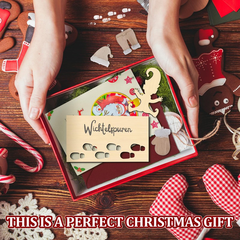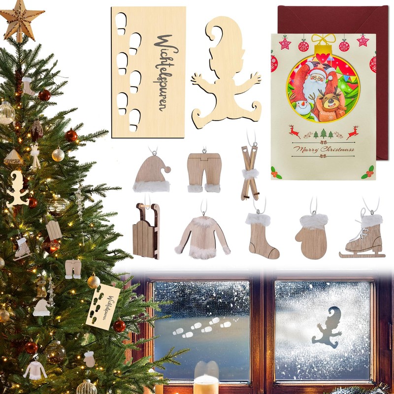 - CHRISTMAS TEMPLATES Our Christmas wooden stencil pack contains 1 gnome stencil and 1 gnome footprint stencil + 8 Christmas tree ornaments + 1 greeting card + 2 lanyards+1 envelope. Use our stencils to make Christmas window decorations. The footprint stencil is 10 x 7 cm and the secret Santa stencil is 8 x 7 cm.