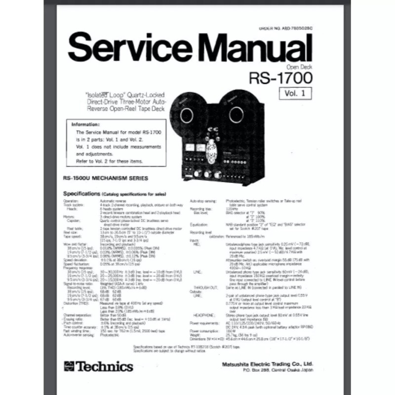 Technics RS-1700 Reel To Reel SERVICE & OWNERS Manual 84 pages comb bound