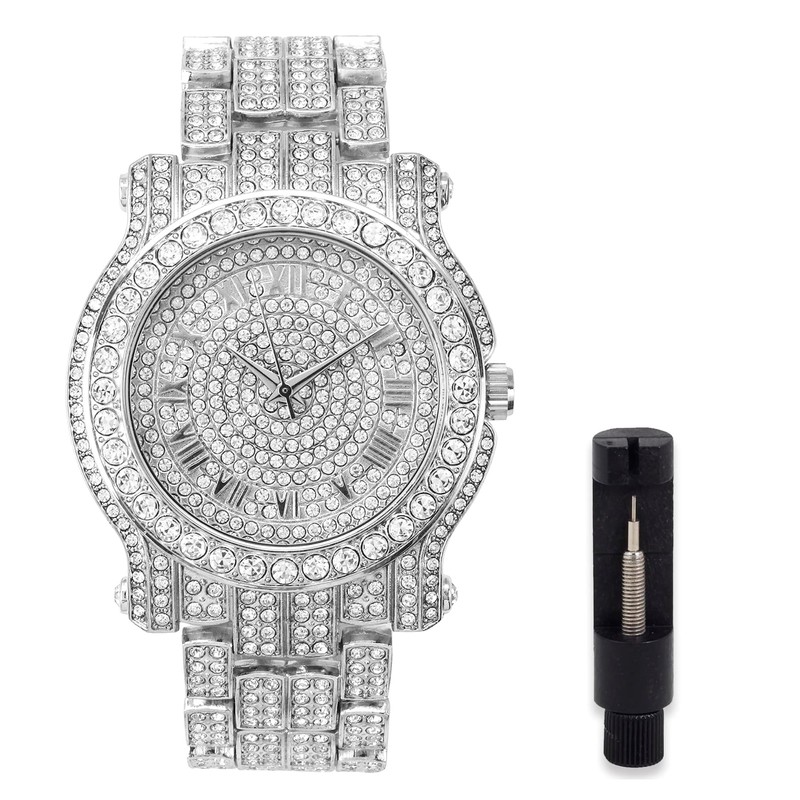 - Iced Out Watch has a 9-inch fully adjustable metal band-- Add or remove links with the link removal tool for easy size adjustments.