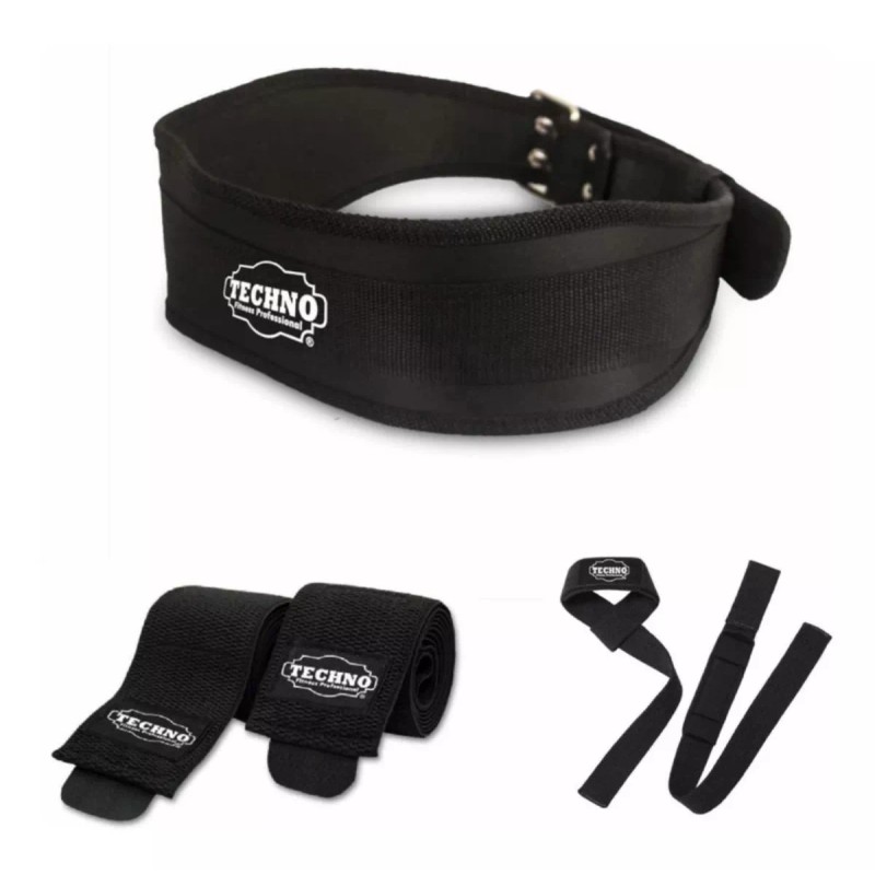 Techno Pesas 3 Pack Premium Cinturón + Rodilleras + Straps