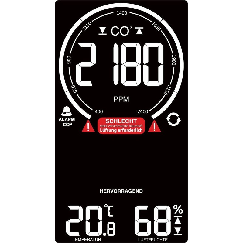 - Practical CO2 traffic light display (green/yellow/red) with ventilation recommendations for quick assessment and interpretation of the current CO2 concentration / automatic CO2 base line calibration (ABC); also manually calibrated.
