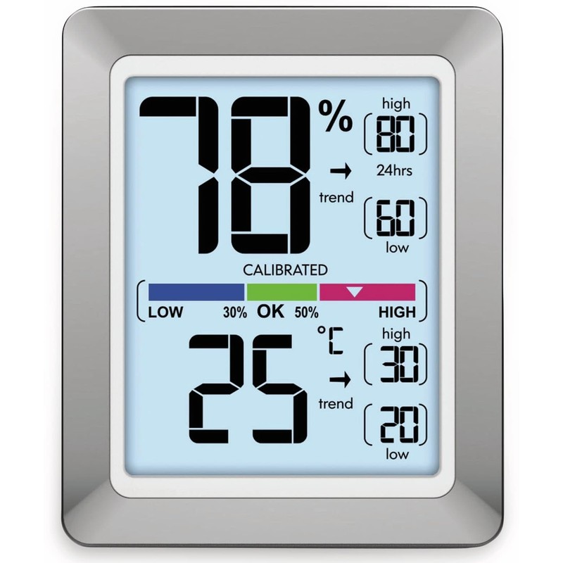 - The small station is not only visually convincing. It also has a lot to offer technically. In addition to humidity, indoor temperature and the coloured scale, the station displays the temperature and humidity trend, as well as the corresponding altitude and lowest values.