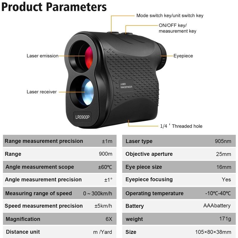 - Golf rangefinder with high precision capabilities, this laser range finder for golf boasts a 900m range and 6x magnification. It ensures a ±1 yard range accuracy and ±1° angle precision, providing swift measurements in just 0.5 seconds.