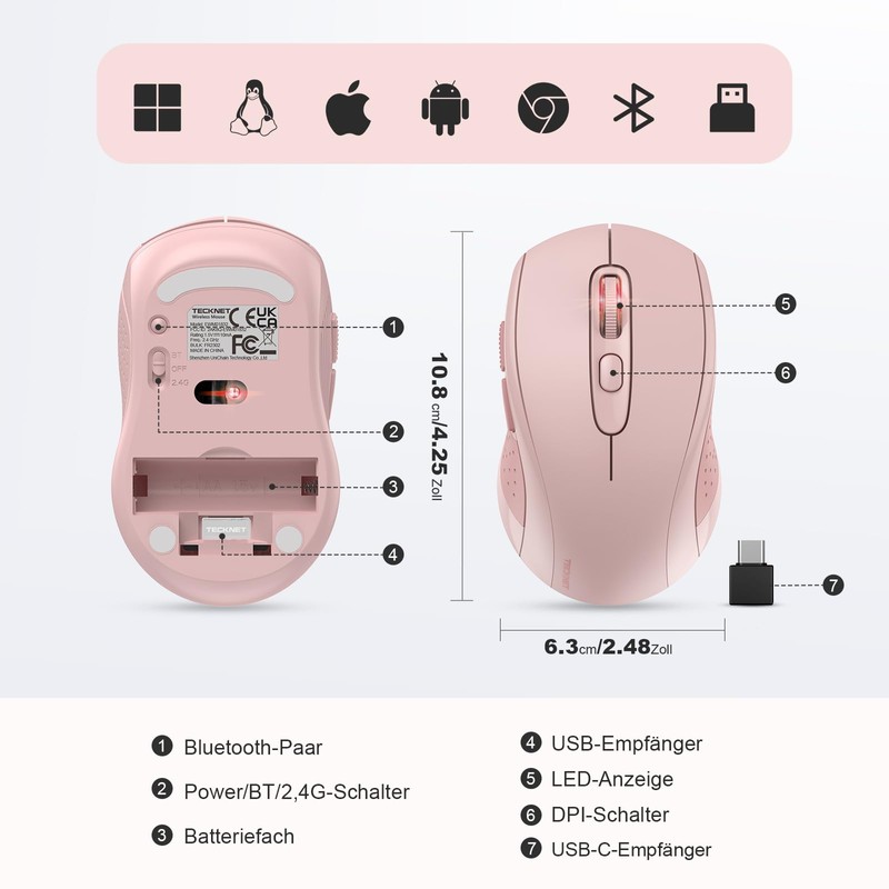 TECKNET Bluetooth Mouse, 2.4G Wireless Mouse (BT 5.0/3.0 + USB A + USB C) 4000 DPI Portable Ergonomic Mouse, 6 Levels DPI Wireless Mouse for Laptops, Mac OS, Android, Windows, Pink