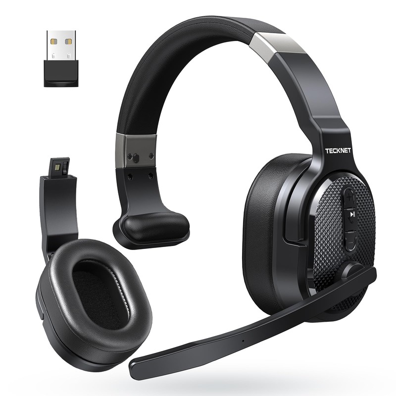 - UP TO 50 HOURS BATTERY LIFE– Trucker bluetooth headset utilizing low power consumption technology, TECKNET headset with microphone for pc with a built-in 400mAh battery can work for more than 50 hours, and stand for more than 200 hours after one full charge. PACKAGE CONTENTS: 1x Wireless Bluetooth Headphones, 1x USB-C Charging Cable, 1x USB Dongle, 1x User Manual, 1x Headset Clamp.