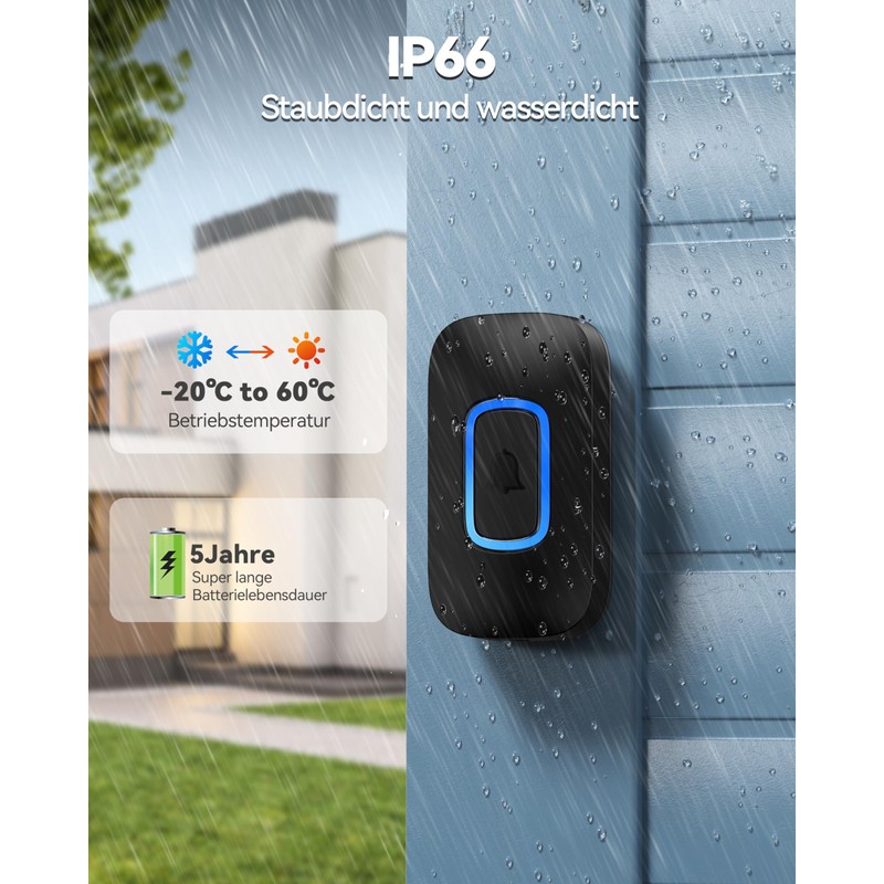 - IP66 waterproof and 4.5 year service life: our wireless doorbell for outdoor use is designed to withstand snow, rain or other harsh weather conditions with its strong IP66 waterproof function and works efficiently between -20°C to 60°C. The push button of the doorbell works with a CR2032 lithium battery with very low power consumption, which has a service life of up to 4.5 years.