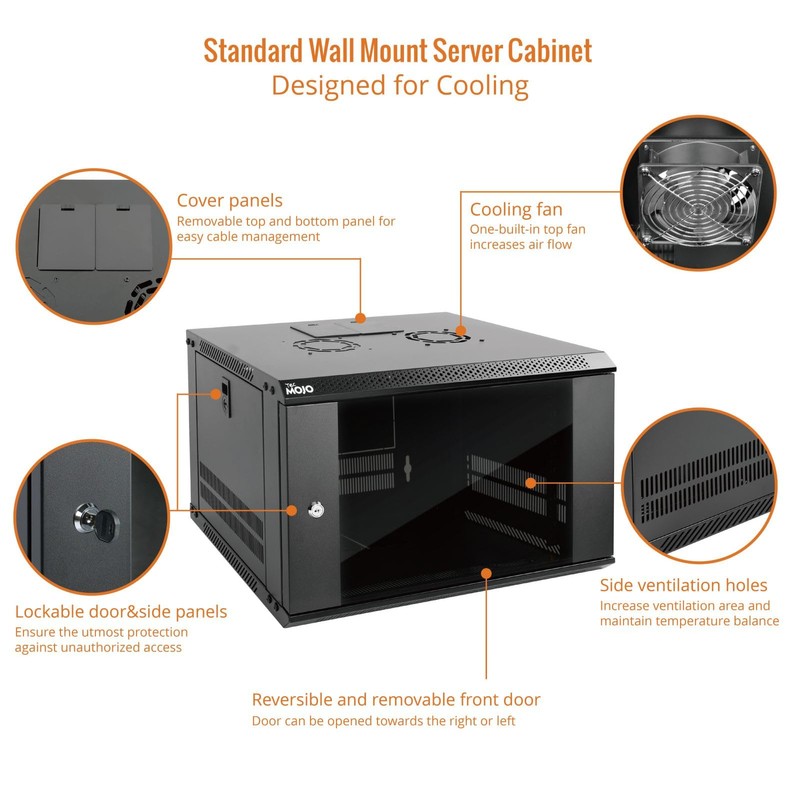 Tecmojo 6U Wall Mount Server Cabinet IT Network Rack Enclosure Lockable Door and Side Panels Black, Cooling Fan, Standard Glass Door, 450mm Depth, for 19” IT Equipment, A/V Devices