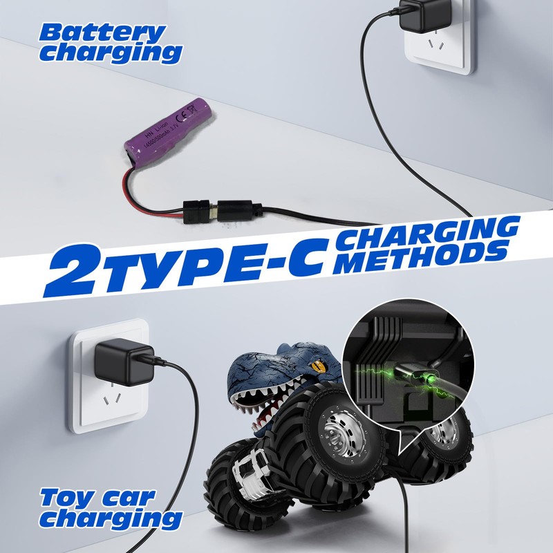 - Einfach Typ-C-Laden: Das Ferngesteuertes Dinosaurier bietet 2 Lademethoden. Über die Type C-Schnittstelle können Sie das Auto ohne Demontage direkt aufladen oder die Batterie separat aufladen. Dieses flexible Ladesystem kann den Spielzeitbedarf von Kindern von mehr als 30-Minuten erfüllen.