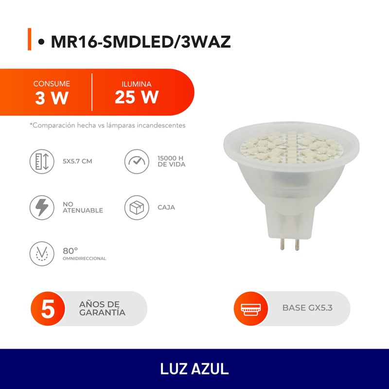 Tecnolite - Foco MR16 LED 3 W, Luz Azul, Base GX5.3, No atenuable