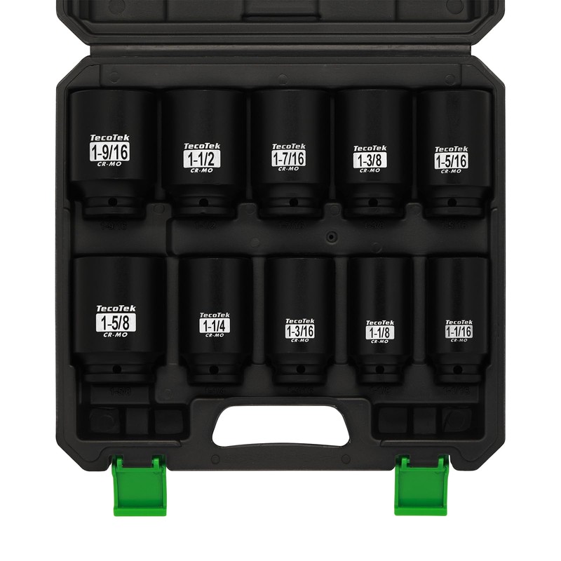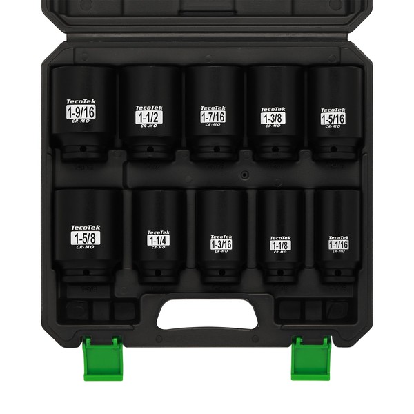 TecoTek 1/2" Drive Deep 6-Point Impact Socket Set, 10-Piece Deep SAE Spindle Axle Nut Impact Socket Set, Cr-Mo, 1-1/16-Inch to 1-5/8-Inch Size, Enhanced Storage Case