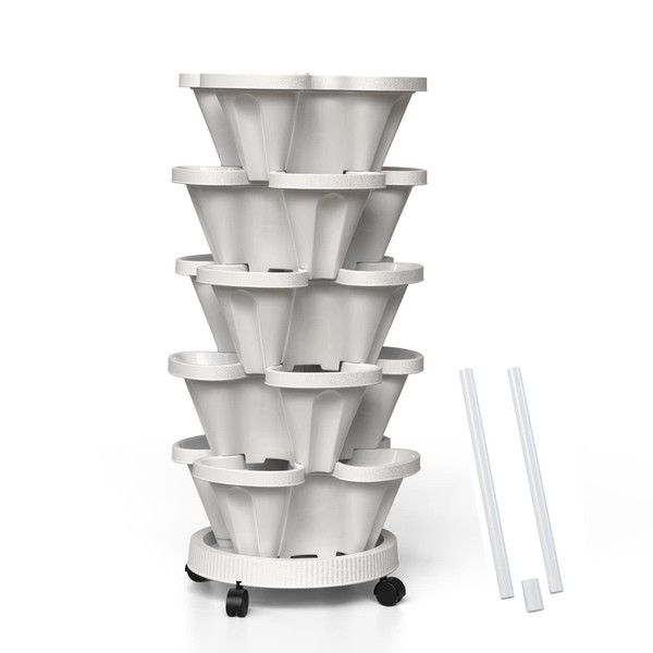 Tectsia Strawberry Vertical Planters, 5 Tiered Stacking Tower Garden with Support Pole, Stackable Herb Vegetable Planters Indoor and Outdoor - White