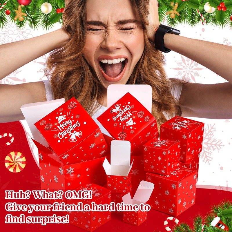 - Classic and Exquisite Design: the product itself is the classic red color of Christmas, with snowflake patterns printed around it and the words "Merry Christmas" printed on the surface; Filled with mirth and giggles, each package includes 12 pcs of Christmas prank gift boxes; Each prank gift box serves as a delightful supplement to your holiday festivities, tricking your family into believing their actual gift is much more eccentric than expected