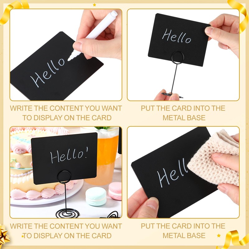 - Easy Usage: the mini chalkboard sign providing a smooth writing surface; You can easily wipe them clean when you need other messages or labels; The metal ring at the top of the wire table stand can easily hold the card, while its wide base ensures it remains stable