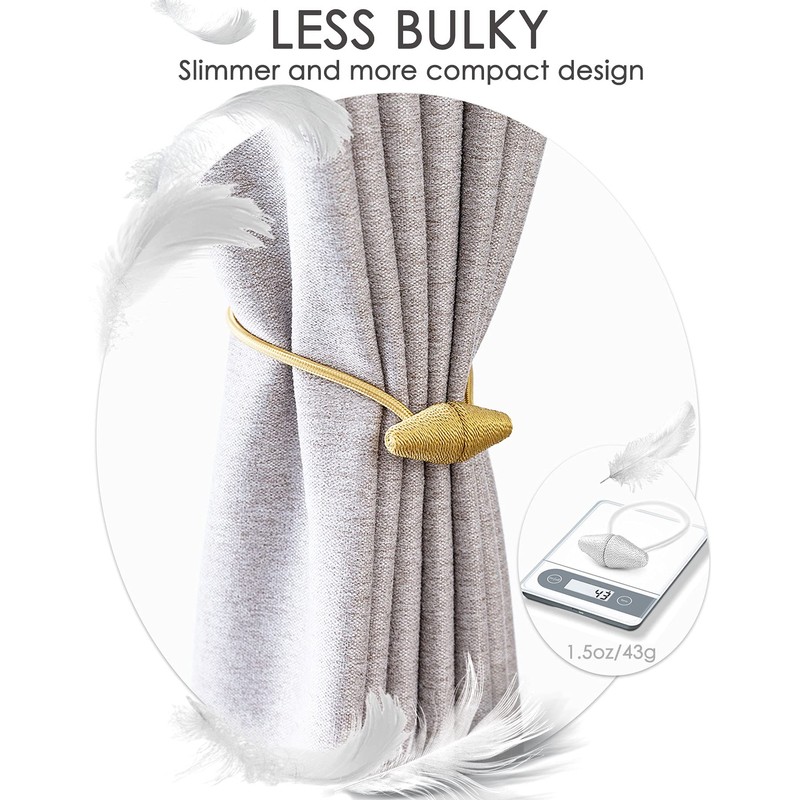 - đź’—STRONGER MAGNET & LESS BULKY: The size of the magnet of our product is 1.5 times that of other products, provide stronger magnetic to hold the drape steady. The overall weight is 10 grams lighter than other products, besides, its' spindle shape looks more compact in visual, which is less bulky, more elegant, and fit for most curtains.