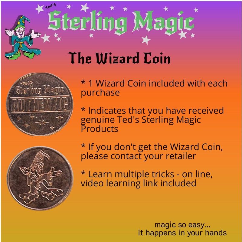 One Wizard Coin is included in every product from Ted’s Sterling Magic. It indicates that you have received genuine Ted’s Sterling Magic products. If there is no Wizard Coin in your package, please contact your retailer. Watch online videos to learn multiple tricks with this coin.