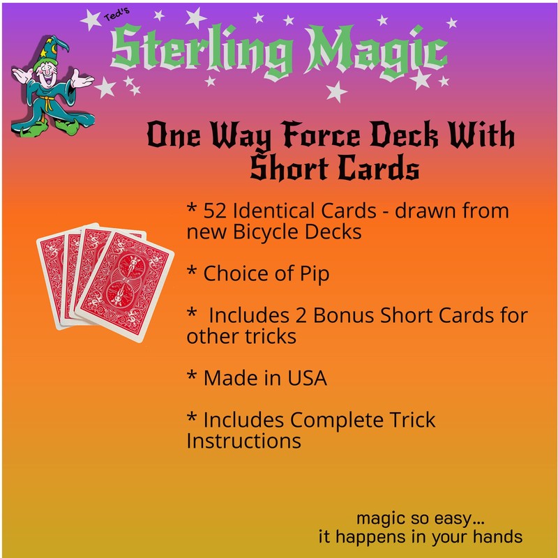 Includes 1 One Way Forcing Deck with Bonus Short Cards, complete instructions and a Wizard Coin.