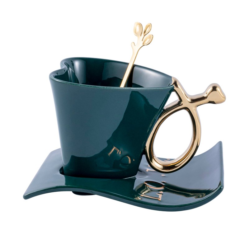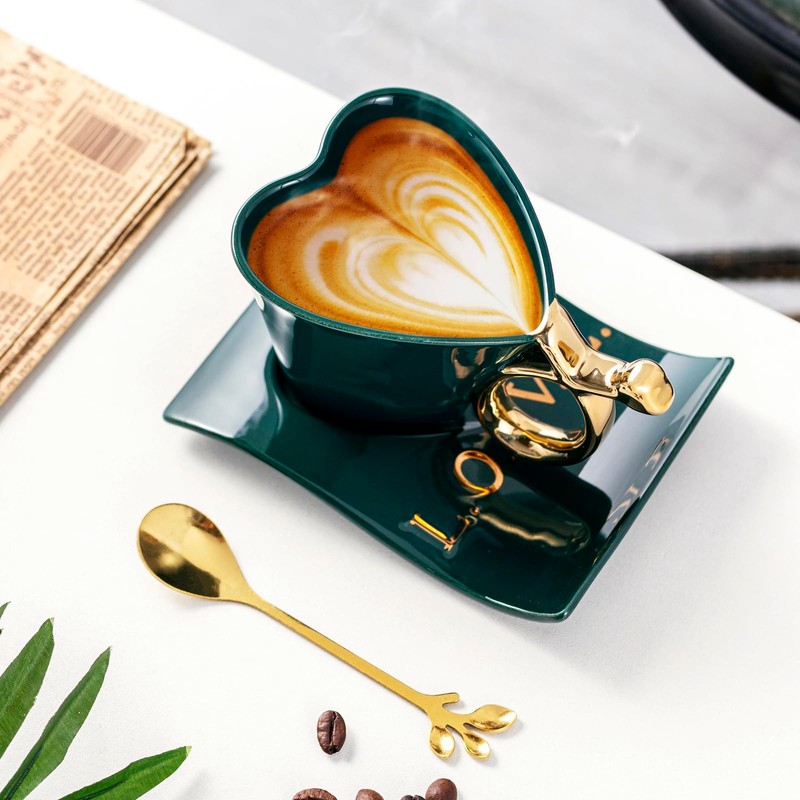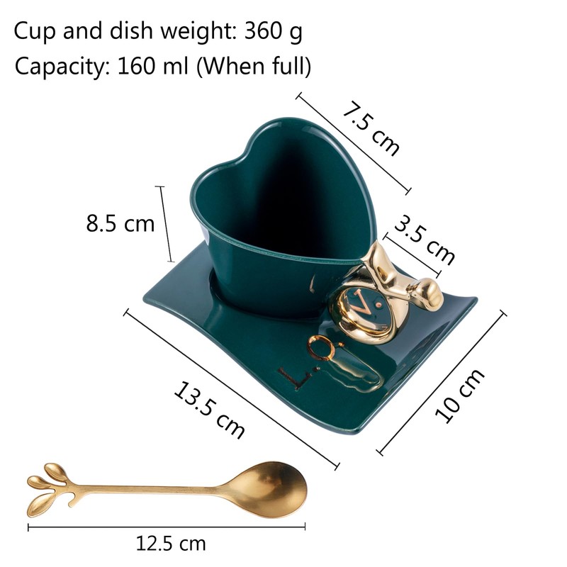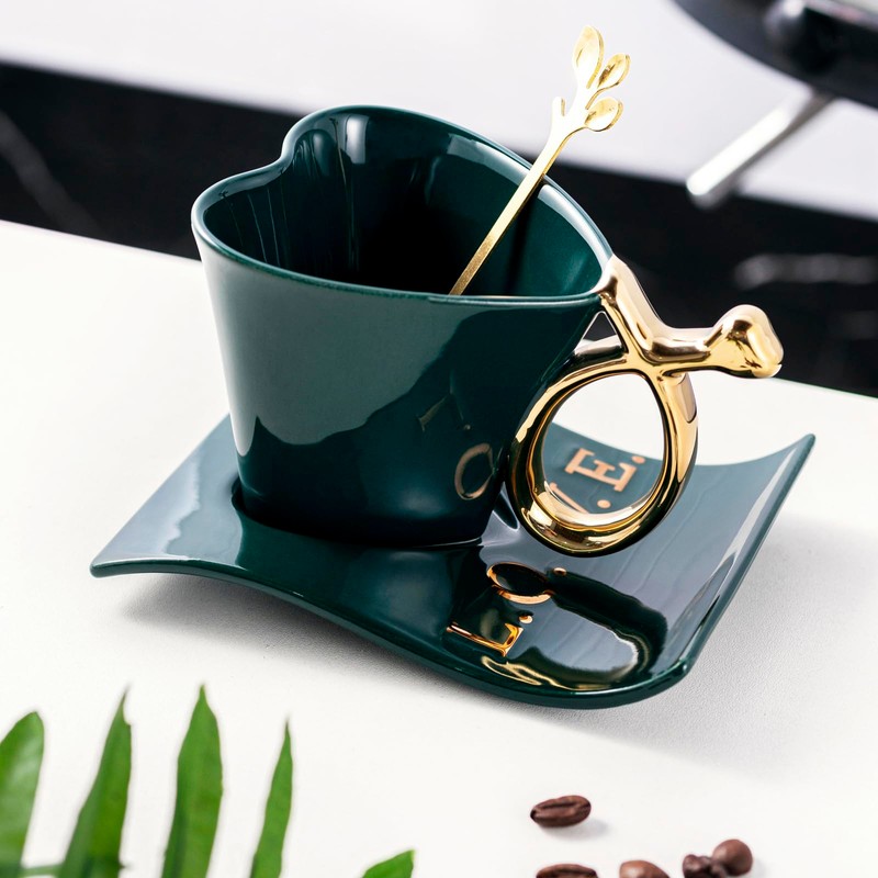 TEDABO 160ml Ceramic coffee cup and Saucer set with Spoon Heart shaped special tea cups (Green)