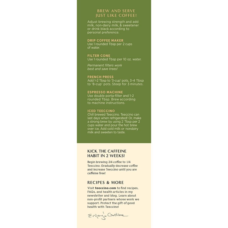 - NATURALLY CAFFEINE FREE - Experience an energy boost from nutrients, not stimulants. Perfect any time of day or night because it won’t interfere with sleep. Sugar-free Teeccino is a treat for the whole family.
