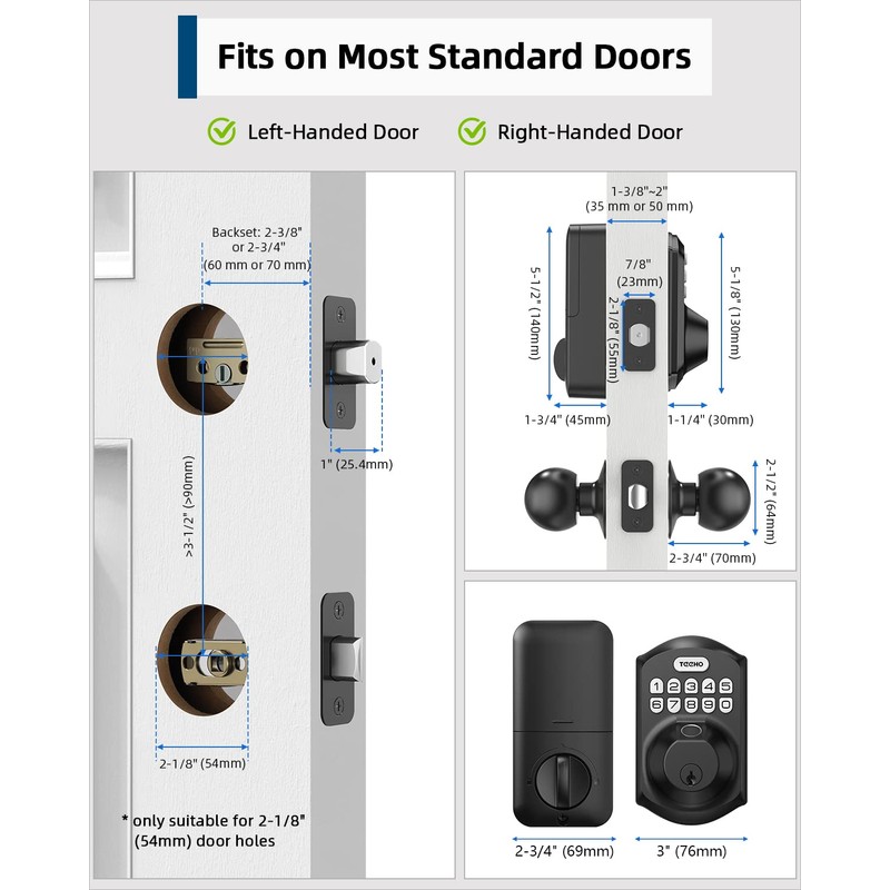 - Easy Installation: Installation is a breeze and can be completed in just minutes with a screwdriver. Our deadbolt smart lock is only suitable for 2-1/8" (54mm) door holes, and is not compatible with 38mm door holes.