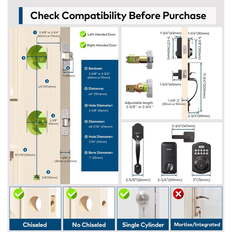 - Easy to Install: TEEEHO keypad door lock with handle can be installed in just 15 minutes with a single screwdriver, no drilling required. It is compatible only with 2-1/8" (54mm) door holes and not suitable for 38mm door holes. Please check door thickness before purchase: 1-3/8" to 2" (35mm-50mm)