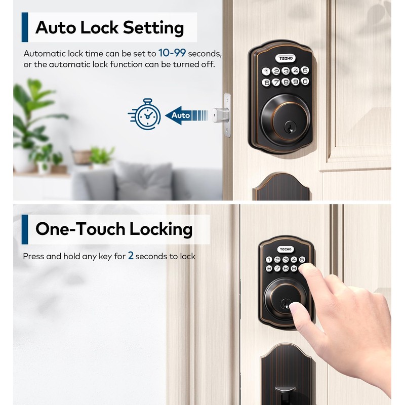 - Auto-Lock & One-Touch Lock: TEEHO electronic keypad deadbolt can be set to automatically lock within 10-99 seconds after the door is closed, or set to disable the auto-lock feature. It can also be manually locked from the outside by pressing and holding any key for 2 seconds.