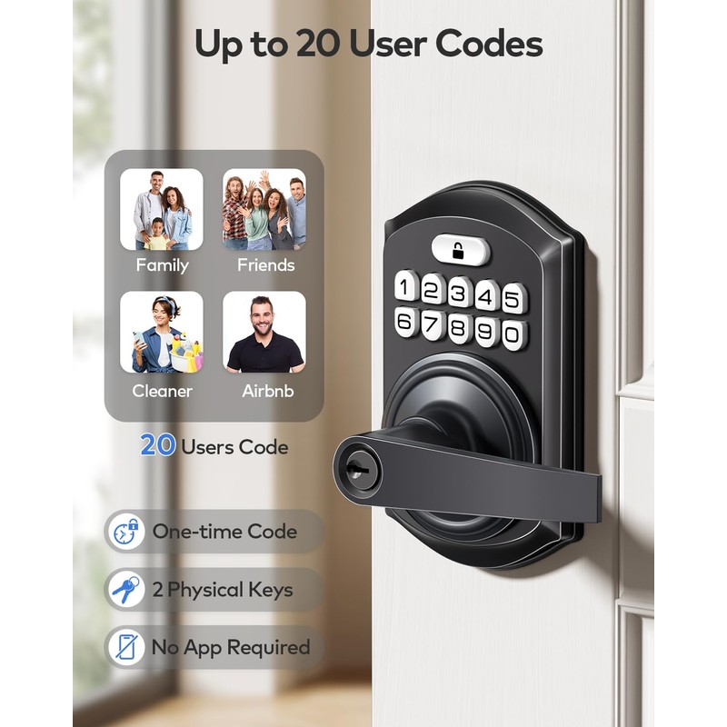 - Passcode Entry: Keypad door lock with handle provides 20 access codes for family use and an available temporary code for the single guest entry, automatically deleted after use, can be set cyclically. Anti-peeking password protects your home security