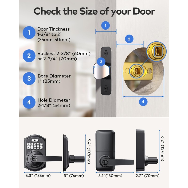 - Easy Installation: Install in minutes with just a screwdriver. TEEHO keypad door lever fits left and right handed doors, and door hole with diameter of 54mm. No extra work on standard door prep