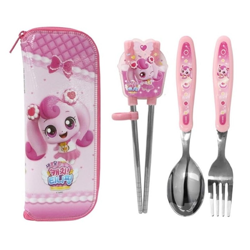 Teenieping Character Fork, Spoon, and Chopsticks Flatware Set with Case, Tableware, Training Chopsticks for Beginners with Silicone Rings (Heartsping)