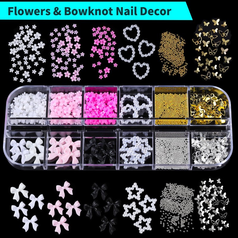 - 3D Nail Art Charm With Bow, Butterfly, Flower, Caviar Beads for Nails: This box contains 3 colors of nail art flowers (2 sizes), 3 colors of bow nail charms, silver/gold butterfly nail charms, silver/gold caviar beads for nails, heart and star nail pearls. Super classic and elegant nail stuff always bring you sweet, modern, classic and romantic feeling, suitable for daily, festival, party, and workplace nail art design