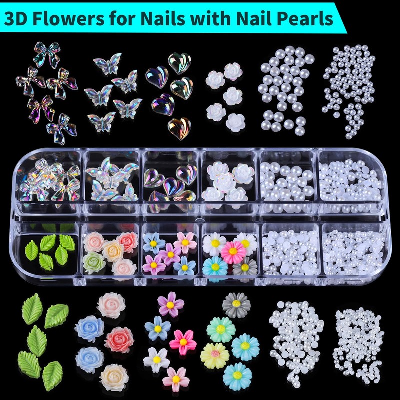 - Summer Flower Manicure Nail Charms Kit: Package include 1 box Flower Nail Supplies for Nails Design(6pcs 5D flowers for nails and 18pcs 3D Hawaii Flowers ice lily nail charms); 1 box 3D Flower Nail Charms with Nail Pearls Butterflies; 1 box 3D Nail Art Charm With Bow, Butterfly, Flower, Caviar Beads for Nails; 1pc Tweezer to pick up bigger 3d flowers for nails; 1pc Wax Pencil can stick small nail gems