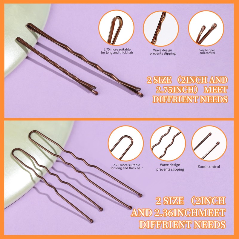 - Brown Bobby Pins and Bun Bobby Pins Set: Come with bobby pins brown hair and u shape bobby pins and hair bands, 3 diffrient hair accessories in one package. 50* 2'' bobby pins +50* 2.75'' large bobby pins +50* 2'' bun bobby pins+ 50* 2.36'' hair pins +100* clear hair bands. Meet almost all needs for hair styles