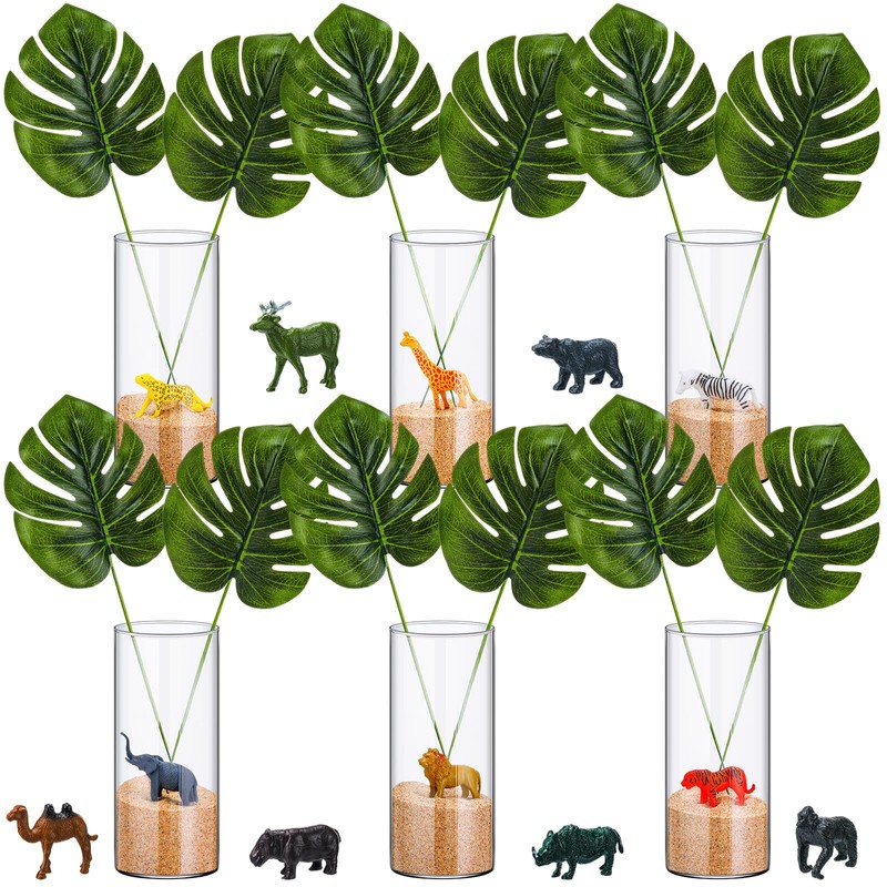 - Comprehensive Decorative Jungle Party Set: experience a package with our jungle animal party decorations set which includes 6 quality glass flower vases, 12 mini simulated animals, 12 simulated turtle back leaves, and a bag of sand for an inclusive 31 piece package; Add this jungle animal centerpieces set to your shopping cart and spice up your party decor now